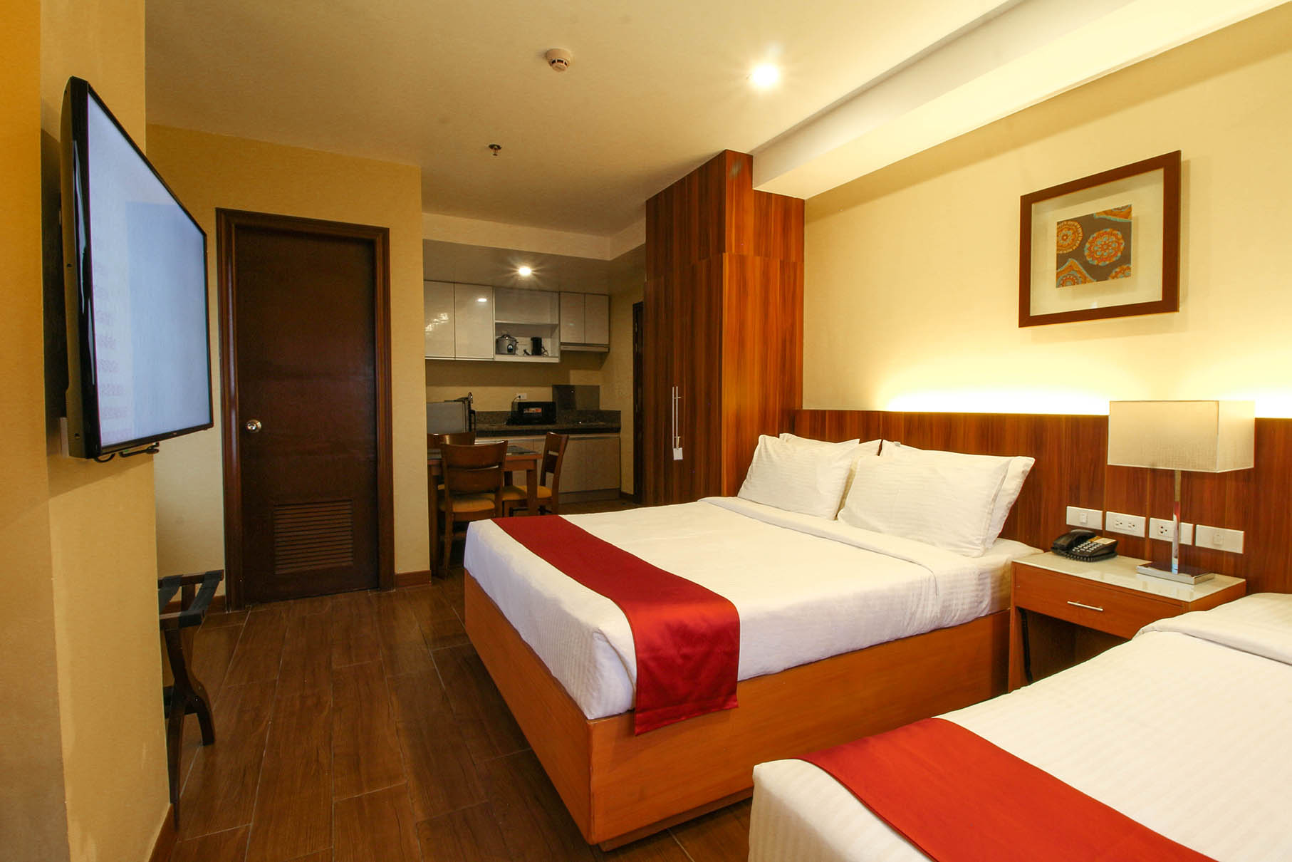 The studio trio has a refrigerator, TV, kitchen, kitchen with cooking facilities, one queen sized bed, one single bed and a private bath.